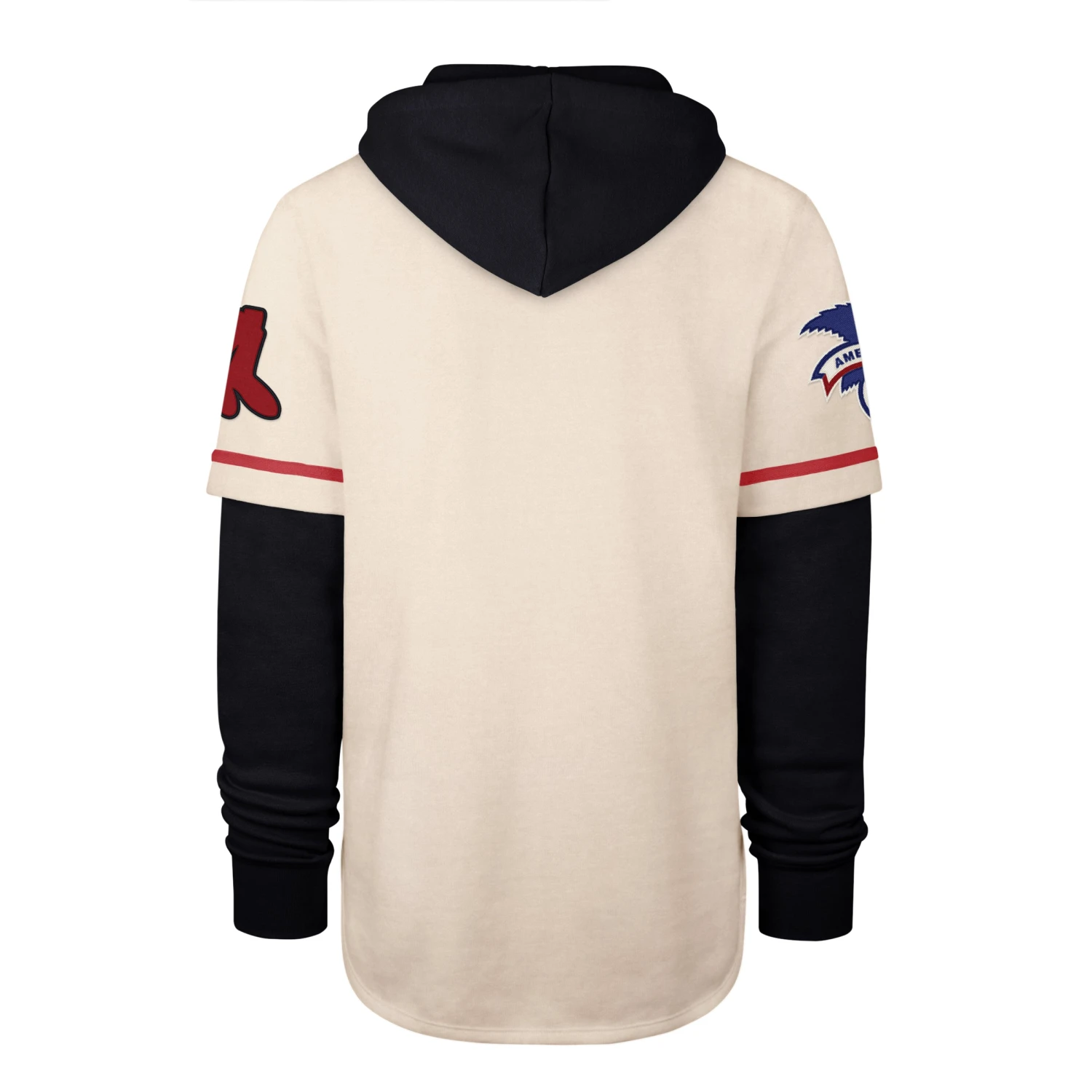 The Trifecta ’47 Shortstop Pullover is made from midweight fleece with a soft, brushed interior. It features contrast sleeves and hood for a layered look. This uniform inspired silhouette has twill appliques across the chest featuring official wordmarks, team logos on the left sleeve, and an AL or NL logo on the right sleeve. 80% cotton, 20% polyester.